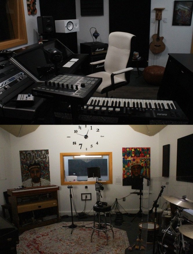 The Recording Studio consists of Raven Monitors, MIDI pad controllers, acoustic instruments and a seating area to best curate a comfortable work environment. A glass panel separates the recording room from the recording booth in which a variety of instruments and mics are available for use.